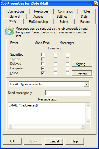 Example: In this example, the Notification Message Text contains the EMAIL="((addresses))" preprocessing reference to a variable "addresses". This can be referenced from multiple jobs so that they can all share the same mailing list.