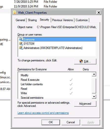 - Check that the physical directory c:\Program Files\ISE\EnterpriseSCHEDULE\web_client\ has the following protection settings: