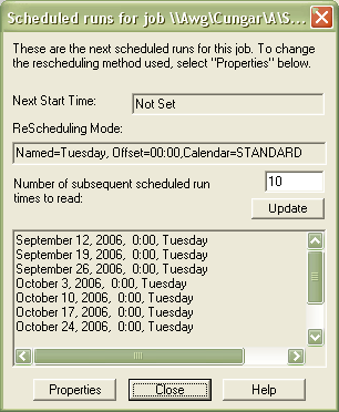 A rescheduled job's future runs may be viewed for planning purposes and to prepare for job activity. A list is displayed showing the next 10 runs of the job according to it's rescheduling settings.