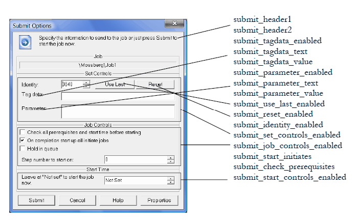 The Submit dialog controls how a job or job stream is started and what stream data is made available.