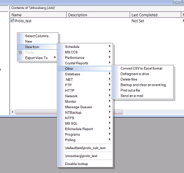If a prototype job does not have a Description then the full path name of the job is placed in the menu list. Submenus are created by adding ":" colons at appropriate places in the description. For an example the Delete files prototype job has as its description Other: Delete Files.