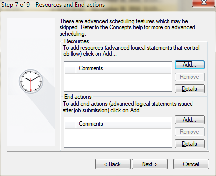 The Resource Requirements of a job are one EnterpriseSCHEDULE's most powerful tools. Using resources you can program all types of advanced logic into your jobs including job switching which allows you to turn off sections of jobs by setting a variable and job intersection which lets you determine whether the job will run based on the value of an integer. To add a resource requirement to a job, click on Resource requirements button and click the Add button.