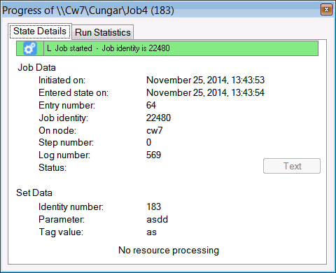 State details provide information about the current state of the job and relevant status such as when it was initiated, job identity and node it resides on. The following is a complete description of all information in the State details window.