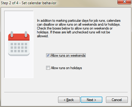 The second step in the creation of a calendar involves setting default calendar behavior for the new calendar. By excluding either weekends or holidays, the calendar can be used to only schedule on weekdays and non-holidays. If the job can be run on these days, do not check these.